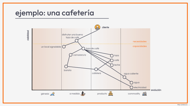 Hasta aquí hemos visto qué es un mapa de Wardley, cómo se representa y cómo interpretar sus elementos. Ahora vamos a verlo en acción con un ejemplo sencillo.